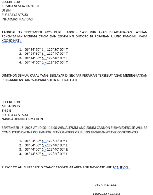 Berita Securite yang di broadcast oleh VTS dan SROP agar kapal kapal di alur pelayaran yang mendekati daerah tersebut agar lebih berhati2