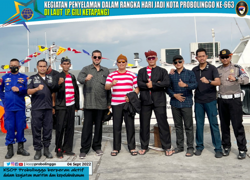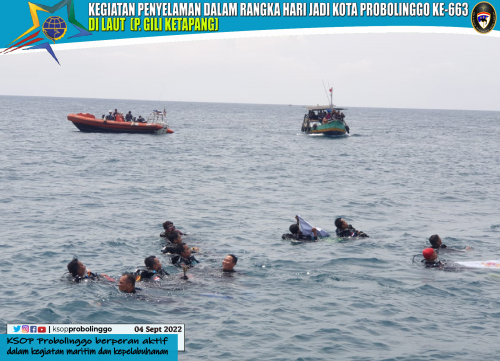 (Probolinggo-4/9) Sebagai bentuk rasa syukur atas Hari Jadi Kota Probolinggo dan menyemarakkan Hari Perhubungan Nasional Tahun 2022 , FORKOPIMDA Kota Probolinggo menggelar kegiatan Penyelaman Bersama di Laut Ds. Gili Ketapang Kec. Sumberasih Kab. Probolinggo dengan kegiatan Pengibaran Panji Pemerintah Kota Probolinggo dilaut bersama Komonitas Selam se Jawa Timur yang diikuti sekitar 45 orang penyelam dengan penanggung jawab Habib Hadi Zainal Abidin S.Pd, MM, M.H.P selaku Walikota Probolinggo.