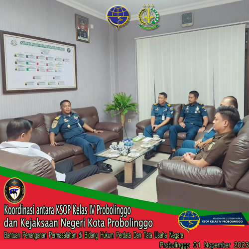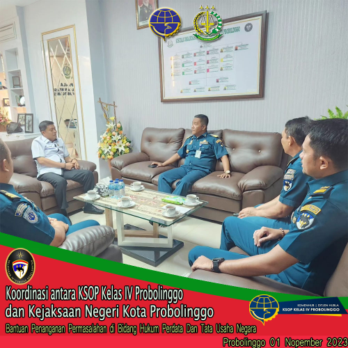 (Probolinggo,02/11) Demi kelancaran tugas pada Kantor KSOP Kelas IV Probolinggo diperlukan kerjasama yang baik serta koordinasi dalam hal aspek legal antara KSOP Kelas IV Probolinggo dengan Instansi Hukum d Probolinggo diantaranya Kejaksaan Negeri Kota Probolinggo.