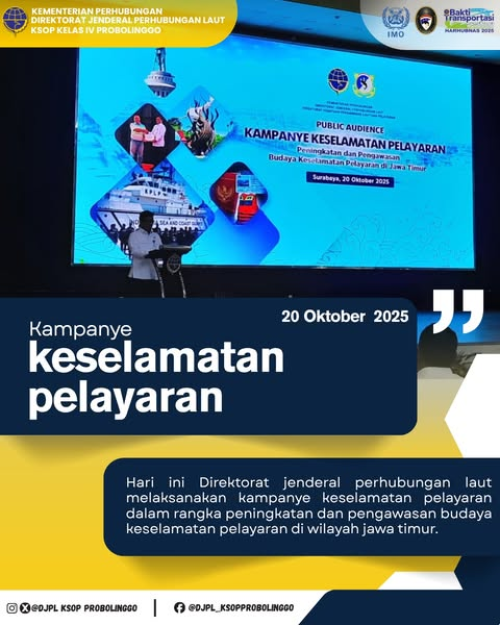 SURABAYA (20/10) – Pada hari ini Senin, 20 Oktober 2025, Kepala Kantor KSOP Kelas IV Probolinggo I Gusti Agung Komang Arbawa, S.H., M.H. dan seluruh Kepala UPT di lingkungan Direktorat Jenderal Perhubungan Laut di Wilayah Jawa Timur menghadiri kegiatan Kampanye Keselamayan Pelayaran di Aula, Politeknik Pelayaran Surabaya.