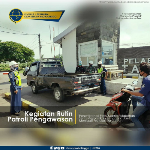 PROBOLINGGO (26/11) - Giat Rutin Patroli Pengawasan Keselamatan dan Keamanan Pelayaran di Pelabuhan Probolinggo meliputi kegiatan pengawasan embarkasi debarkasi penumpang di Pelabuhan Rede Penyebrangan Probolinggo - Gili Ketapang, dimana kunjungan wisatawan yang hendak menyebrang ke Pulau Gili Ketapang dari Pelabuhan Probolinggo menggunakan Kapal Pelra cukup banyak. Oleh karena itu giat pengawasan keselamatan dan kemanan pelayaran harus dilakukan secara ketat seperti awak kapal dan penumpang wajib memakai life jacket, serta kapal harus dilengkapi dengan alat keselamatan, serta wajib memakai masker dan jaga jarak yang merupakan bagian dari protokol kesehatan. Setelah itu giat patroli pengawasan keselamatan dan keamanan pelayaran dilakukan di Terminal Umum PT. DABN Cabang Probolinggo, dengan mengawasi langsung kegiatan bongkar muat barang di Jetty 1 dan Jetty 2. Salah satu tujuan dari kegiatan ini untuk meminimalisir resiko kecelakaan kerja para TKBM di Pelabuhan serta mencegah pencemaran baik di darat maupun di laut. Kegiatan selanjutnya adalah melakukan giat penegakkan protokol kesehatan di Pintu Masuk Gate Pelindo III Cabang Probolinggo dengan mengawasi secara langsung kendaraan keluar masuk yang melakukan aktivitas bongkar muat serta para pengguna jasa dan pelaku jasa yang melakukan aktivitas kepelabuhanan di Pelabuhan Probolinggo dengan mewajibkan memakai masker yang merupakan upaya dari pencegahan penyebaran virus korona COVID-19 di Pelabuhan Probolinggo. Giat Rutin Patroli Pengawasan Keselamatan dan Keamanan Pelayaran di Pelabuhan Probolinggo merupakan bagian dari kegiatan rutin piket 1x24 jam dan merupakan wajib bagi setiap pegawai KSOP Kelas IV Probolinggo, dimana sistem jam kerja yang sudah diatur secara bergiliran karena KSOP Kelas IV Probolinggo menerapkan sistem pelayanan 1x24 jam untuk mewujudkan pelayanan yang prima.