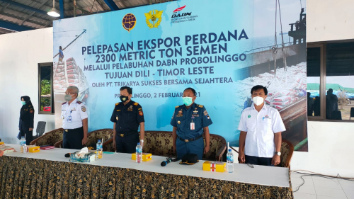 PROBOLINGGO (2/2) - Pelabuhan Umum PT. DABN Cabang Probolinggo untuk kali pertama melayani kegiatan ekspor perdana pada Selasa (02/02) pagi. Pelabuhan yang dikelola PT. Delta Artha Bahari Nusantara (DABN) ini dilepas secara simbolis ekspor semen dengan tujuan Dili, Timor Leste oleh Kepala Kantor Pengawasan dan Pelayanan Bea dan Cukai Probolinggo, Andi Hermawan. Acara dihadiri oleh Kepala Kantor Kesyahbandaran dan Otoritas Pelabuhan Kelas IV Probolinggo Capt. Subuh Fakkurochman, Sekretaris Dishub Prov. Jatim Luhur Prihadi Kepala Cabang PT. DABN Probolinggo Gatot Supriyono dan Direktur PT. Trikarya Sukses Bersama Sejahtera Wahyu Nuryuda selaku Eksportir.
