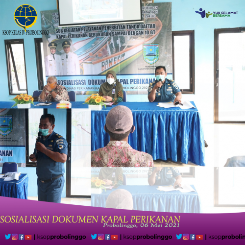 (Probolinggo-08/05) Dinas Perikanan Kabupaten Probolinggo melaksanakan Sosialisasi Dokumen Kapal Perikanan tanggal 06 Mei 2021 di Aula Dinas Perikanan Kabupaten Probolinggo dengan dihadiri Instansi dari Cabang Dinas Kelautan dan Perikanan Propinsi Jawa Timur, KSOP Kelas IV Probolinggo dan Perwakilan Nelayan di Kabupaten Probolinggo