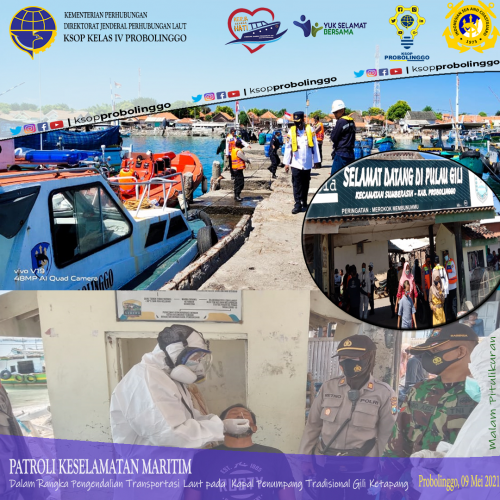 (Probolinggo-09/05) Patroli Keselamatan Maritim dalam rangka pengendalian transportasi laut, di lakukan oleh KSOP Kelas IV Probolinggo dengan melibatkan unsur instansi terkait yaitu Kodim 0820 probolinggo, Polresta probolinggo, Satpol Air Polres probolinggo, Polsek Mayangan, Polsek Sumber Asih, Dinas Kesehatan probolinggo, KKP Probolinggo.