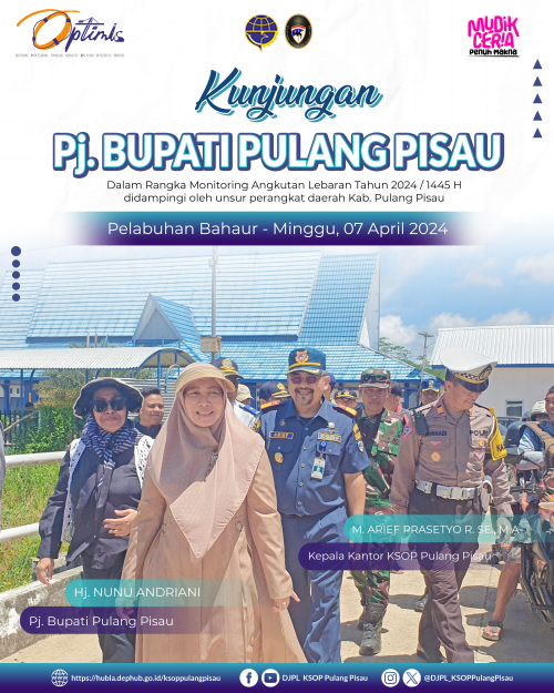 Kepala Kantor KSOP Pulang Pisau - menerima kunjungan PJ.Bupati Pulang Pisau dalam rangka monitoring angkutan lebaran Tahun 2024 1445 H didampingi oleh unsur perangkat daerah Kab. Pulang Pisau di Pelabnuhan Bahaur, Kabupaten Pulang Pisau.