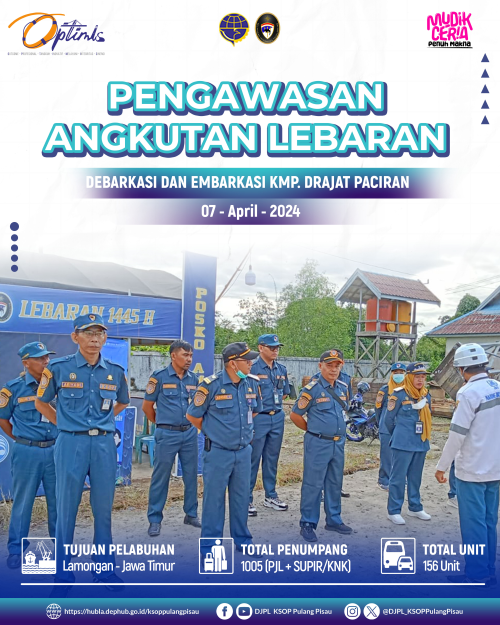 Pada hari minggu tanggal 7 April 2024 pukul 14:00 WIB, telah dilaksanakan Monitoring Keberangkatan KMP. Drajat Paciran dari : Bahaur (Pulang Pisau) - Paciran (Lamongan) dengan data sbb :