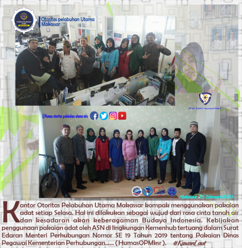 Kantor Otoritas Pelabuhan Utama Makassar kompak menggunakan pakaian adat setiap Selasa. Hal ini dilakukan sebagai wujud dari rasa cinta tanah air dan kesadaran akan keberagaman Budaya Indonesia.
