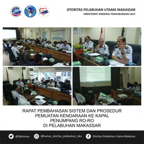 Bertempat di ruang rapat Bonerate, Kepala Kantor Otoritas Pelabuhan Makassar Rahmatullah membuka rapat mengenai pembahasan sistem dan prosedur pemuatan kendaraan ke kapal penumpang Ro-Ro di Pelabuhan Makassar.