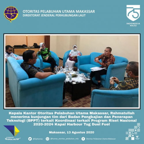 tim dari Badan Pengkajian dan Penerapan Teknologi (BPPT) di Ketuai oleh Prof. Dr. Ir. Buana Ma'ruf, M.Sc, MM melakukan kunjungan ke Pelabuhan Makassar dan bertemu dengan Kepala Kantor Otoritas Pelabuhan Utama Makassar terkait Koordinasi terkait Program Riset Nasional 2020-2024 Kapal Harbour Tug Duel Fuel.