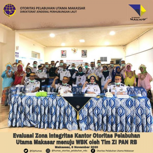 Kantor Otoritas Pelabuhan Utama Makassar melaksanakan evaluasi zona integritas Tahun 2020 oleh Tim ZI Kemenpan RB, pelaksanaan evaluasi ini merupakan tahap lanjutan bagi nominator ZI yang telah lolos survei hasil pelaksanaan RB ZI, Proses evalusi dilaksanakan secara daring zoom meeting dan tetap mengikuti protokol kesehatan, menjaga jarak dan memakai masker.