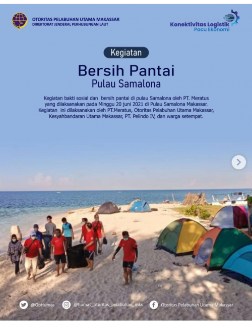 Kantor Otoritas Pelabuhan Utama Makassar melaksanakan Kegiatan bakti sosial dan bersih pantai di Pulau Samalona oleh PT. Meratus yang dilaksanakan di Pulau Samalona Makassar. Kegiatan ini dilaksanakan oleh PT. Meratus, Otoritas Pelabuhan Makassar, Kesyahbandaran Utama Makassar, PT. Pelindo IV dan warga setempat.