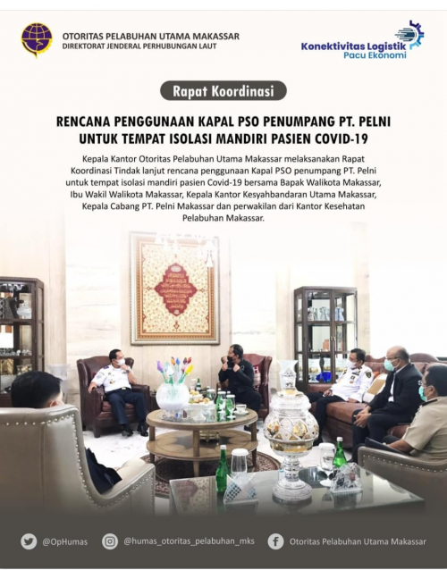 Kepala Kantor Otoritas Pelabuhan Utama Makassar, Bambang Gunawan melaksanakan Rapat Koordinasi Tindak lanjut rencana penggunaan Kapal PSO penumpang PT. Pelni untuk tempat isolasi mandiri pasien Covid-19 bersama Walikota Makassar, Wakil Walikota Makassar, Kepala Kantor Kesyahbandaran Utama Makassar, Kepala Cabang PT. Pelni Makassar dan perwakilan dari Kantor Kesehatan Pelabuhan Makassar.