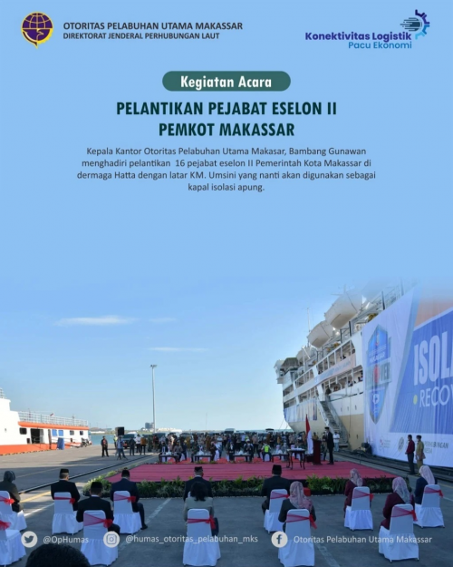 Kepala Kantor Otoritas Pelabuhan Utama Makassar, Bambang Gunawan menghadiri pelantikan 16 Pejabat Eselon II Pemerintah Kota Makassar di Dermaga Hatta dengan latar KM. Umsini yang nanti akan digunakan sebagai kapal isolasi apung.