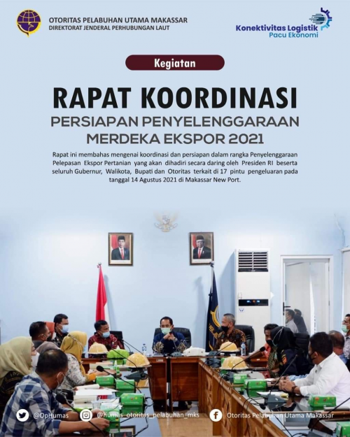 Rapat dihadiri oleh Kepala Pusat Karantina Tumbuhan dan Keamanan Hayati Nabati, Andi M Adnan serta membahas mengenai koordinasi dan persiapan dalam rangka Penyelenggaraan Pelepasan Ekspor Pertanian yang akan dihadiri secara daring oleh Presiden RI beserta seluruh Gubernur, Walikota, Bupati dan Otoritas terkait di 17 pintu pengeluaran pada tanggal 14 Agustus 2021 di Makassar New Port.
