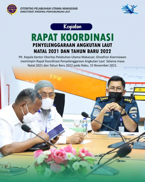 Plt. Kepala Kantor Otoritas Pelabuhan Utama Makassar, Ghoefron Koerniawan memimpin Rapat Koordinasi Penyelenggaraan Angkutan Laut Selama masa Natal 2021 dan Tahun Baru 2022 pada Rabu, 15 November 2021.