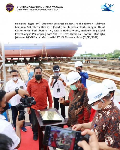 Pelaksana Tugas (Plt) Gubernur Sulawesi Selatan, Andi Sudirman Sulaiman bersama Sekretaris Direktur (Sesditjen) Jenderal Perhubungan Darat Kementerian Perhubungan RI, Marta Hadisarwono, melaunching Kapal Penyebrangan Penumpang Roro 500 GT Lintas Kaledupa – Tomia – Binongko (Wakatobi) KMP Sultan Murhum II di PT. IKI, Makassar, Rabu (01/12/2021).