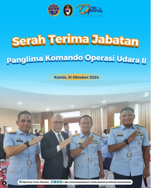 Kepala Kantor Kesyahbandaran dan Otoritas Pelabuhan Utama Makassar, Capt. Sahattua P Simatupang, M.M.,M.H.,CGCAE menghadiri Serah Terima Jabatan Panglima Komando Operasi Udara II dengan Irup Panglima Komando Operasi Udara Nasional yang bertempat di Lapangan Apel Makoopsud II, Makassar, pada hari Kamis, 31 Oktober 2024