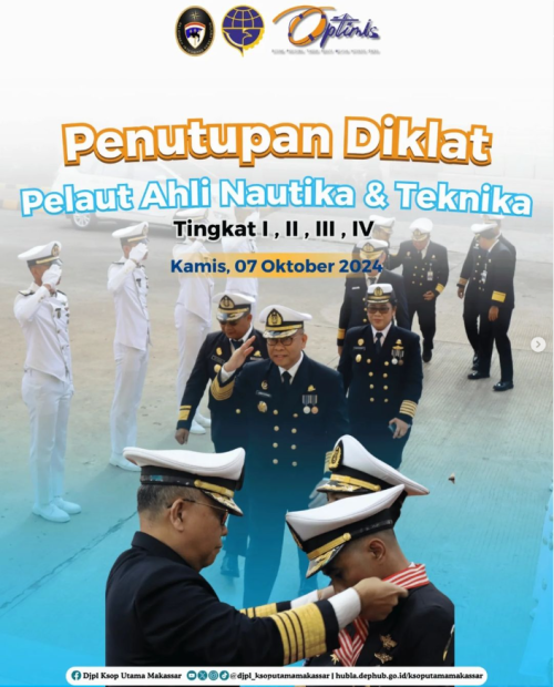 Kepala Kantor Kesyahbandaran dan Otoritas Pelabuhan Utama Makassar Capt. Sahattua P. Simatupang menjadi inspektur upacara pada acara penutupan Pendidikan dan Latihan (Diklat) Pelaut Ahli Nautika dan Teknika tingkat I, II, III, dan IV di Politeknik Ilmu Pelayaran Makassar. Upacara penutupan ini digelar pada Kamis, 7 November 2024, di Kampus II Gedung Geofisika PIP Makassar.