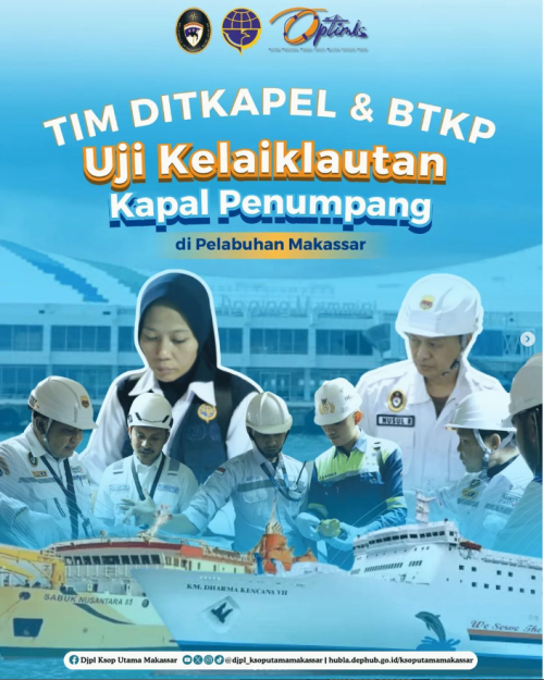 Tim yang dipimpin oleh Kasubdit Kepelautan Capt. Indang Noerkajati, M.M, dari Direktorat Perkapalan dan Kepelautan Bersama Tim BTKP, Tim BKI ,didampingi Kepala Bidang Perkapalan dan Kepelautan Nusul R. Ritha, ST bersama para kepala Seksi dan Pejabat Pemeriksa Keselamatan Kapal (PPKK) Kantor KSOP Utama Makassar melakukan pemeriksaan terhadap Kapal KM. Sabuk Nusantara 85 dan KM. Dharma Kencana VII di Pelabuhan Makassar.