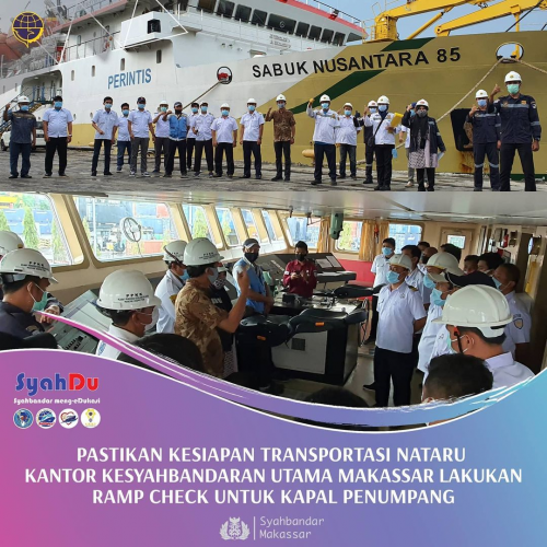 Kementerian Perhubungan cq. Direktorat Jenderal Perhubungan Laut melalui Kantor Kesyahbandaran Utama Makassar melaksanakan Ramp Check guna memeriksa kesiapan Angkutan Natal dan Tahun Baru 2020. Dimulai tanggal 19 November 2020 tim Marine Inspector Kantor Kesyahbandaran Utama Makassar melaksanakan Ramp Check kepada kapal penumpang dengan rute Makassar untuk memastikan kelayakan serta kelaikan kapal penumpang guna mempersiapkan Angkutan Natal dan Tahun Baru 2020. Agar terciptanya keselamatan dan keamanan pelayaran.