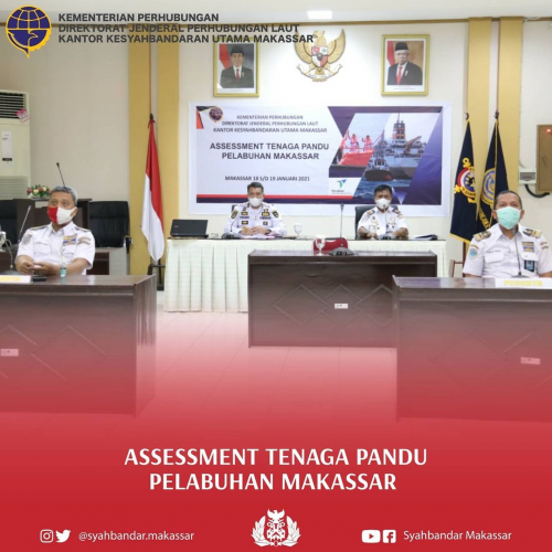 Kantor Kesyahbandaran utama makassar melakukan assessment tenaga pandu dalam rangka menunjang keselamatan keamanan pelayaran di Pelabuhan Makassar acara assessment ini dibuka oleh Kepala Kantor Kesyahbandaran Utama Makassar Bpk H. Ahmad Wahid ST, MT, M.Mar.E dan dihadiri GM PT. Pelindo IV Cabang Makassar Aris Tunru secara virtual zoom Meeting. Kepala Kantor Kesyahbandaran Utama Makassar Dalam amanahnya dengan adanya tes assessment ini maka kita berharap tidak ada kecelakaan kapal (zerro accidents) saat memandu kapal, maka dari itu semua pandu harus profesional dalam bertugas sesuai SOP yang telah ditetapkan, pada hari pertama ini ketua pelaksana assessment Kabid Kesbel Triono S.Pel, MM didampingi Kasie Tertib Bandar Alimin Mokodompit ST, M.Mar.E memandu acara pembukaan hingga tes tertulis berakhir dan akan dilanjutkan tes wawancara pada hari ke 2