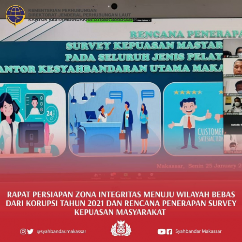 Rapat Persiapan Zona Integritas menuju Wilayah Bebas dari Korupsi Kantor Kesyahbandaran Utama Makassar adalah bukti bahwa Kantor Kesyahbandaran Utama Makassar bertekad untuk melakukan pembenahan dan perbaikan dalam berbagai sektor terutama dalam memberikan pelayanan yang terbaik kepada masyarakat. Di dalam rapat dibahas juga tentang Rencana penerapan survey kepuasan masyarakat yang Terintegrasi langsung ke kantor Pusat Kemenhub.