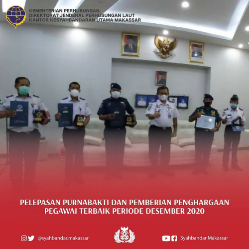 Pelepasan purnabakti dan pemberian penghargaan pegawai terbaik periode Desember 2020. Bertempat di ruang Kepala Kantor Kesyahbandaran Utama Makassar.