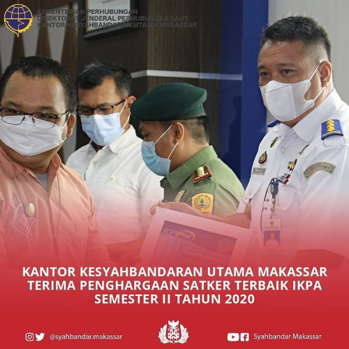 Kantor Kesyahbandaran Utama Makassar berhasil meraih peringkat terbaik ke III dalam Penilaian IKPA semester II tahun 2020 KPPN Makassar. Kabid Keselamatan Berlayar Triono S.Pel.MM mewakili Kantor Kesyahbandaran Utama Makassar dalam penyerahan tersebut.