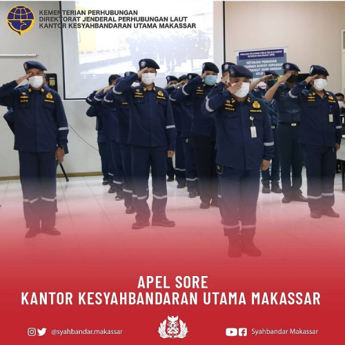 Apel Sore Kantor Kesyahbandaran Utama Makassar, sebagai pembina Apel Kabid Keselamatan Berlayar Bapak Triono S.Pel.MM. Di ikuti seluruh pegawai Kantor Kesyahbandaran Utama Makassar baik secara virtual (WFH) maupun yg hadir langsung dalam hal ini adalah pegawai yang sedang bertugas di Kantor.